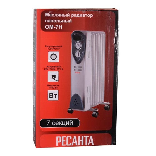 Масляный радиатор Ресанта ОМ-7Н предназначен для поддержания комфортной температуры в жилых и нежилых помещениях. Это электрический отопительный прибор мощностью 1500 Вт, которого вполне достаточно для обогрева помещения комнаты площадью до 15 м2.