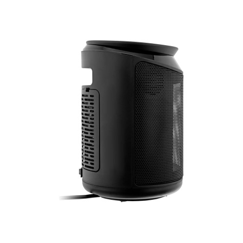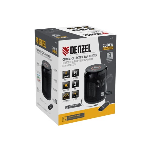 Тепловентилятор Denzel DTFC-2000X мощностью 2 кВт, с керамическим нагревательным элементом, пультом и динамиком, с функцией вращения и возможностью подключения по Wi-Fi, имеет 3 режима работы.