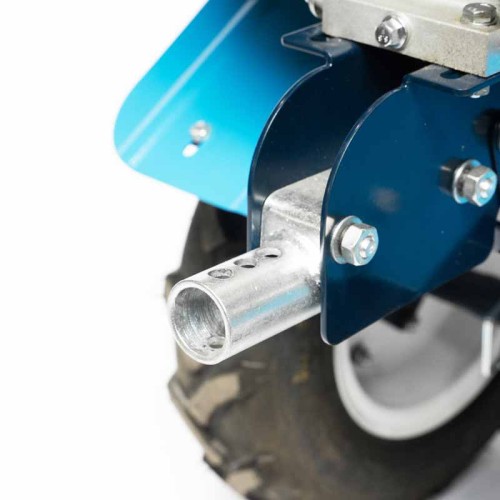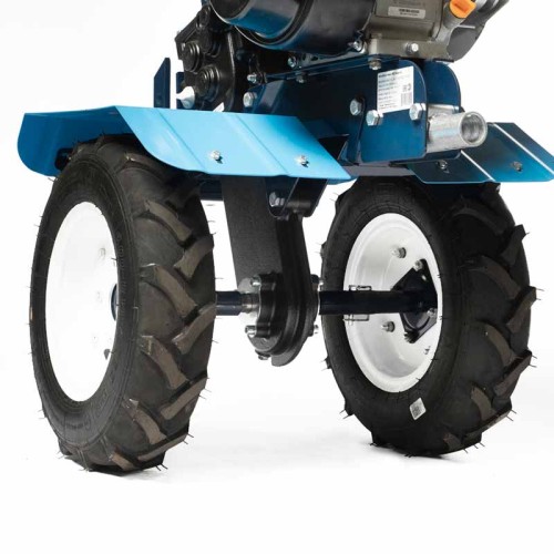 Пневматические колеса 4.00*8 с протектором «елочка» обеспечивают хорошее сцепление с грунтом. В зависимости от обрабатываемой почвы на мотоблок устанавливается от с 4-мя, 6-тью и 8-мью фрезами, ширина обработки: 600 - 850 мм., глубина до 150 мм.