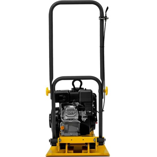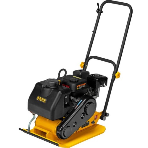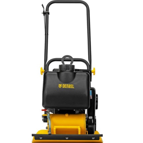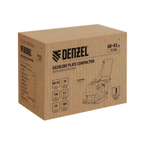 Виброплита бензиновая Denzel VC-30W с основанием размером 60 х 45 см, оснащена двигателем объемом 196 см3, баком для воды, и воздействует на поверхность с центробежной силой 30 кН.